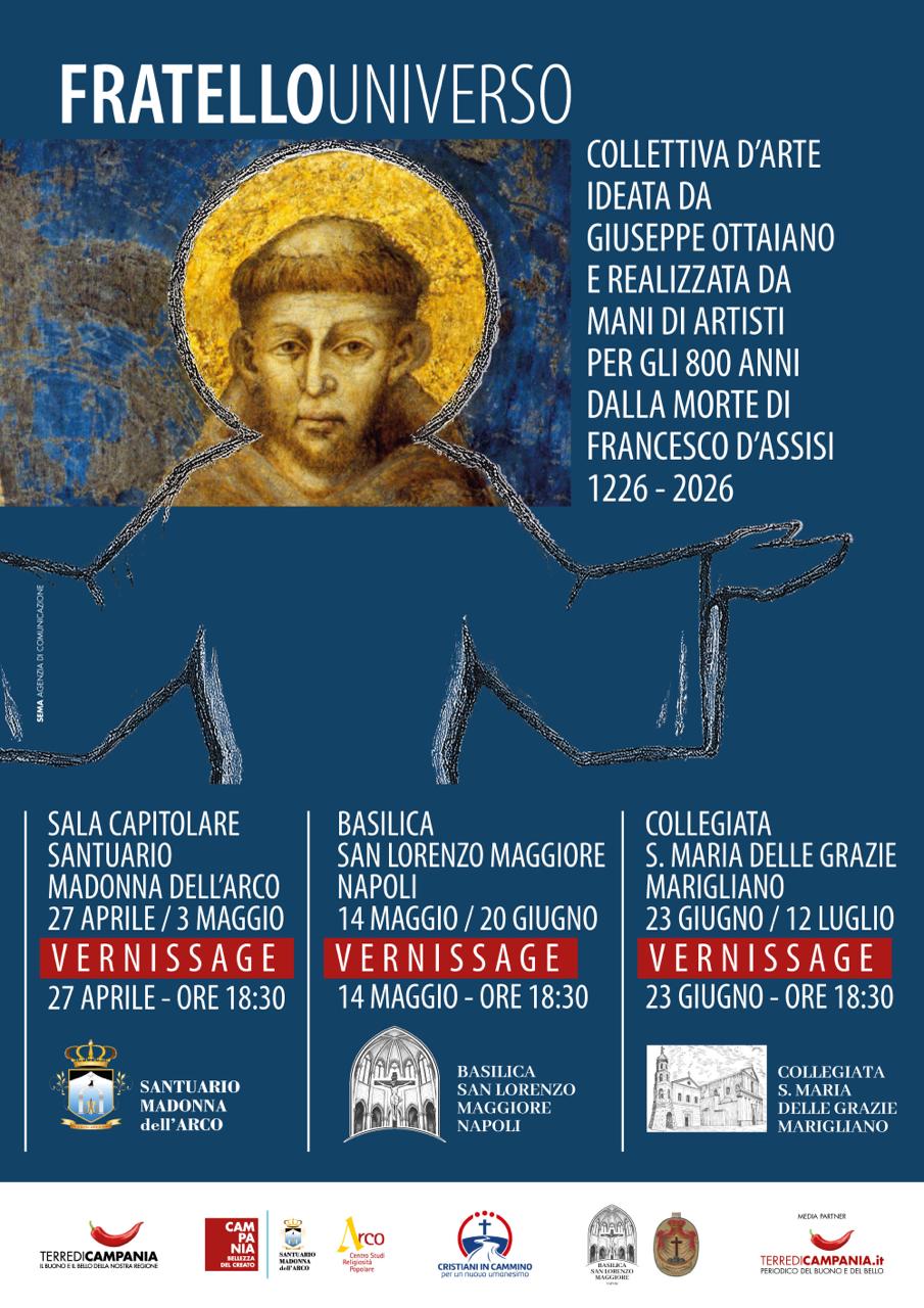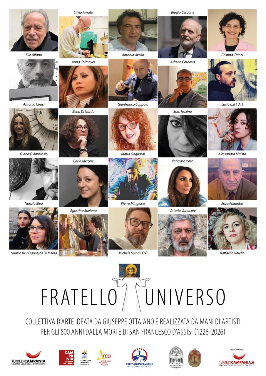 Il desiderio di rendere omaggio a Francesco non con una celebrazione formale, ma con un atto vivo, corale, contemporaneo, ha generato in Giuseppe Ottaiano, responsabile di Terre di Campania, l’idea di realizzare un racconto polifonico attraverso l’arte, linguaggio che parla a tutti e da tutti è riconosciuto. FRATELLO UNIVERSO nasce per trasformare la memoria in esperienza, il ricordo in visione, la storia in una presenza che ancora oggi ci interroga, ci commuove, ci chiama.