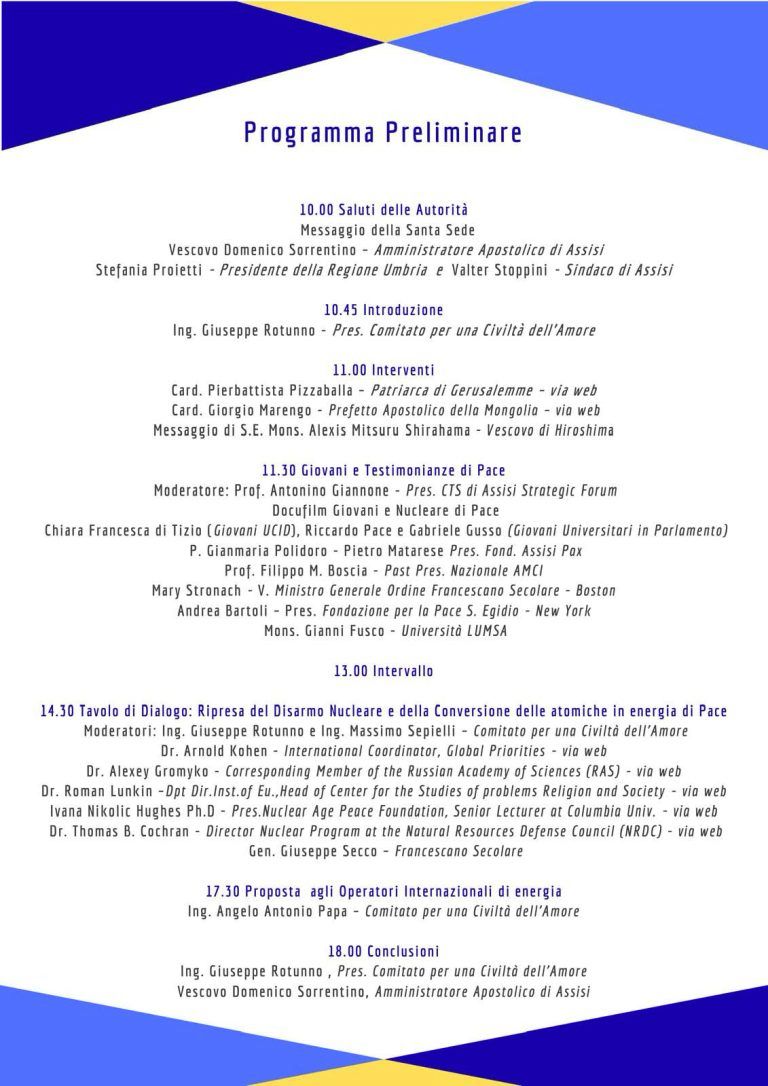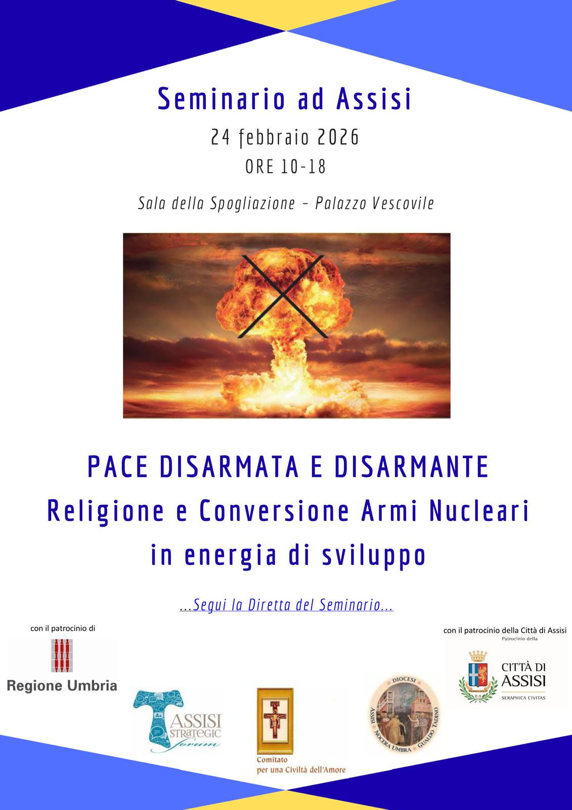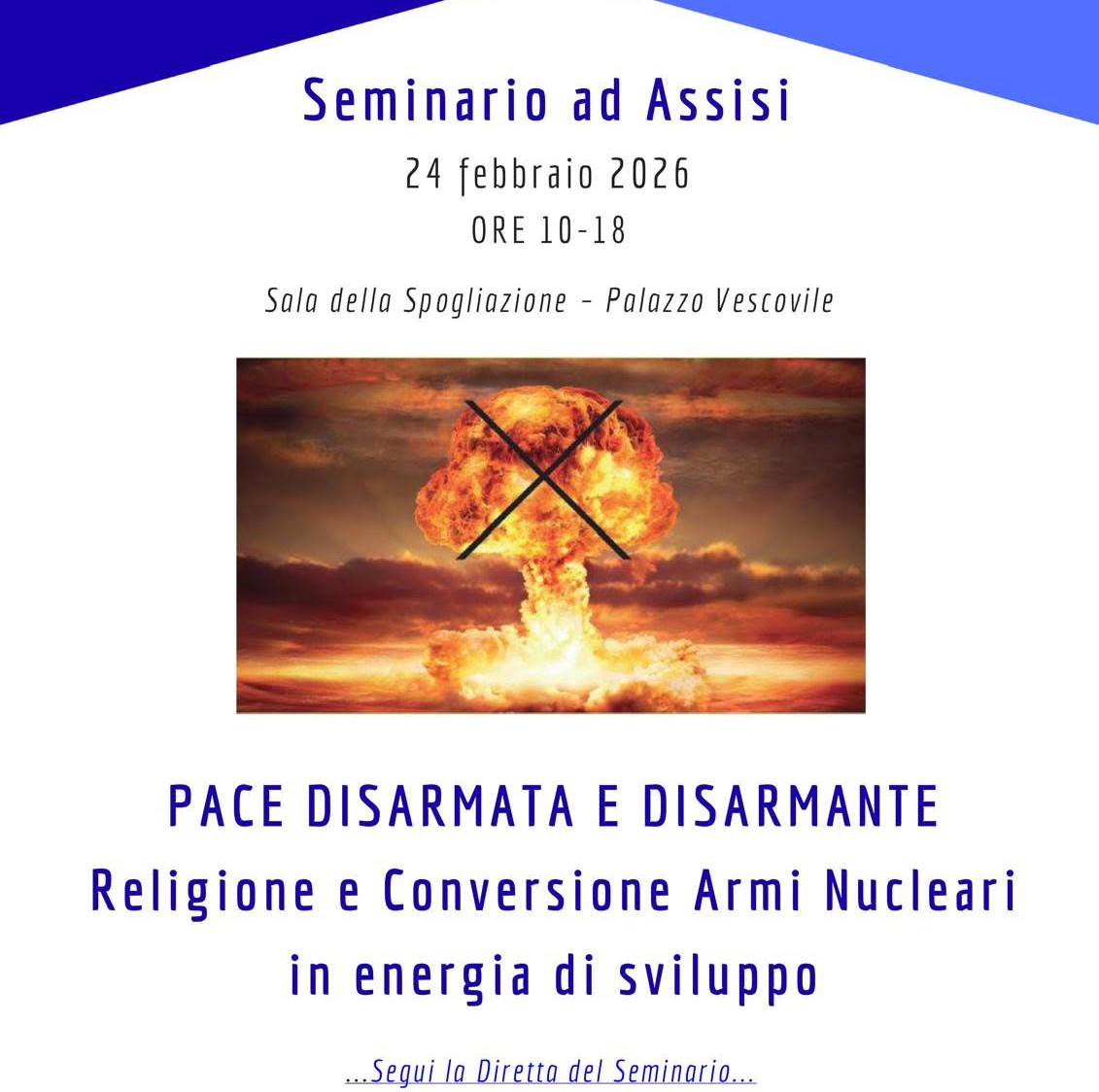 Martedì 24 febbraio 2026 ad Assisi, Città della Pace, nella Sala della Spogliazione di San Francesco, con inizio alle ore 10:00, si tiene il Seminario internazionale per la Pace nucleare, a cui parteciperanno Cardinali e Vescovi (Hiroshima e Assisi), esperti nucleari di USA, Russia e Italia, Testimoni di Pace.