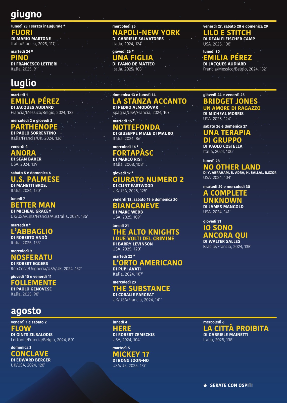 La kermesse porta il Cinema all’aperto fino al 6 agosto. Da “Parthenope” di Paolo Sorrentino a “U.S. Palmese” dei Manetti Bros, da “Follemente” di Paolo Genovese a “Una terapia di gruppo” di Paolo Costella. Tanti i titoli stranieri come “Anora” di Sean Baker, “Better man” di Micheal Gracey, “La stanza accanto” di Pedro Almodovar, “Biancaneve” di Marc Webb, “A complete unknown” di James Mangold. Programma completo su Facebook e Instagram di Arci Movie e sul sito www.arcimovie.it.