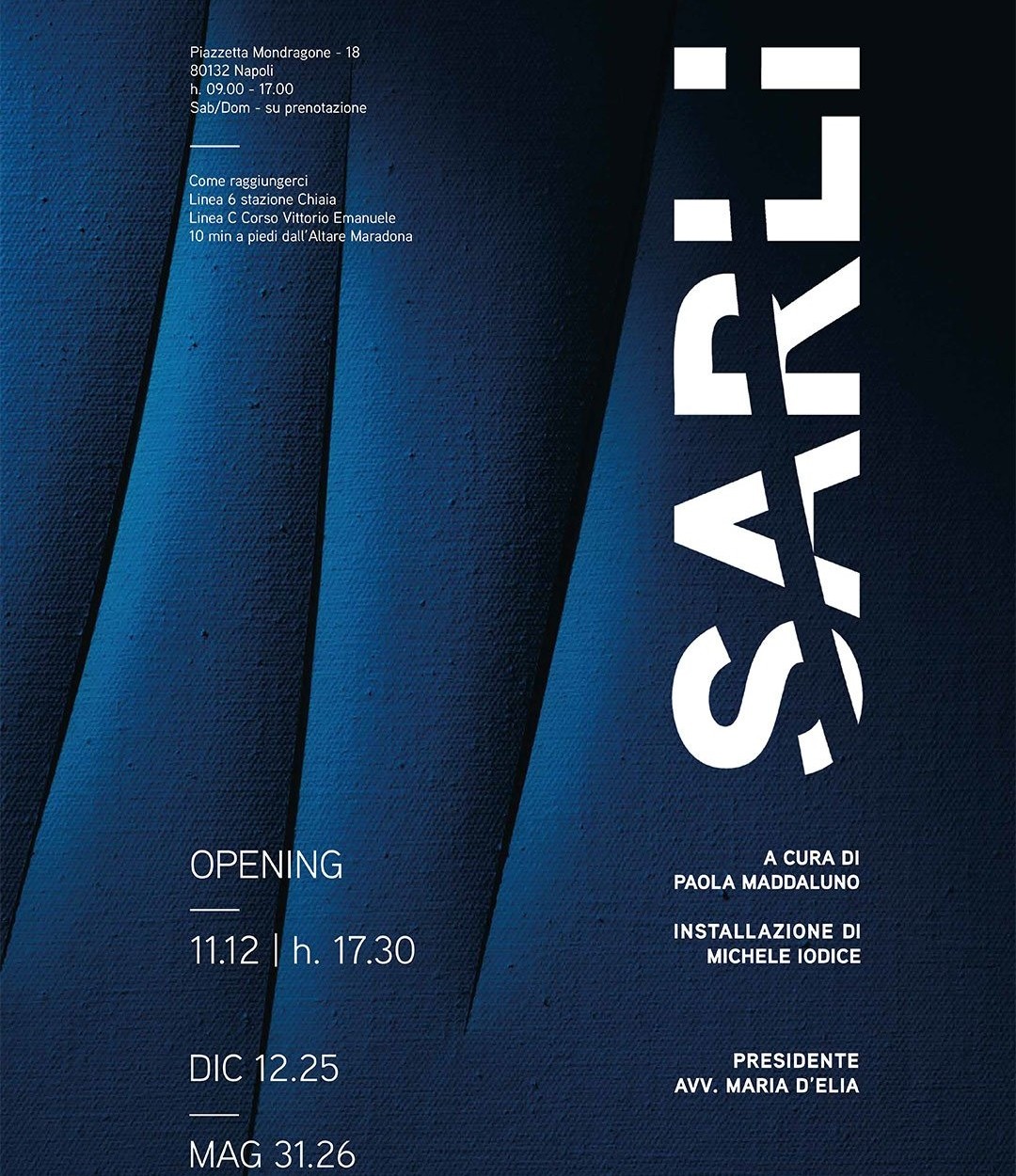 L’allestimento dell’esposizione, curato da Michele Iodice, punta sul binomio nero-oro, colori iconici del marchio Sarli, che trasformano lo spazio espositivo in un percorso costruito di luci e ombre, simbolicamente analogo ai pieni e vuoti delle architetture di stoffa create dal maestro. Gli abiti sembrano emergere fluttuanti dal buio della sala, proprio come sculture dalla prigionia del marmo. Attraverso un percorso espositivo articolato in cinque sezioni – movimento, colore, suono, concetto, attesa – ci si può calare nell’universo visionario di questo stilista-architetto, fatto di opere di rigorosa bellezza e, al contempo, espressione della grande tradizione del Made in Italy.