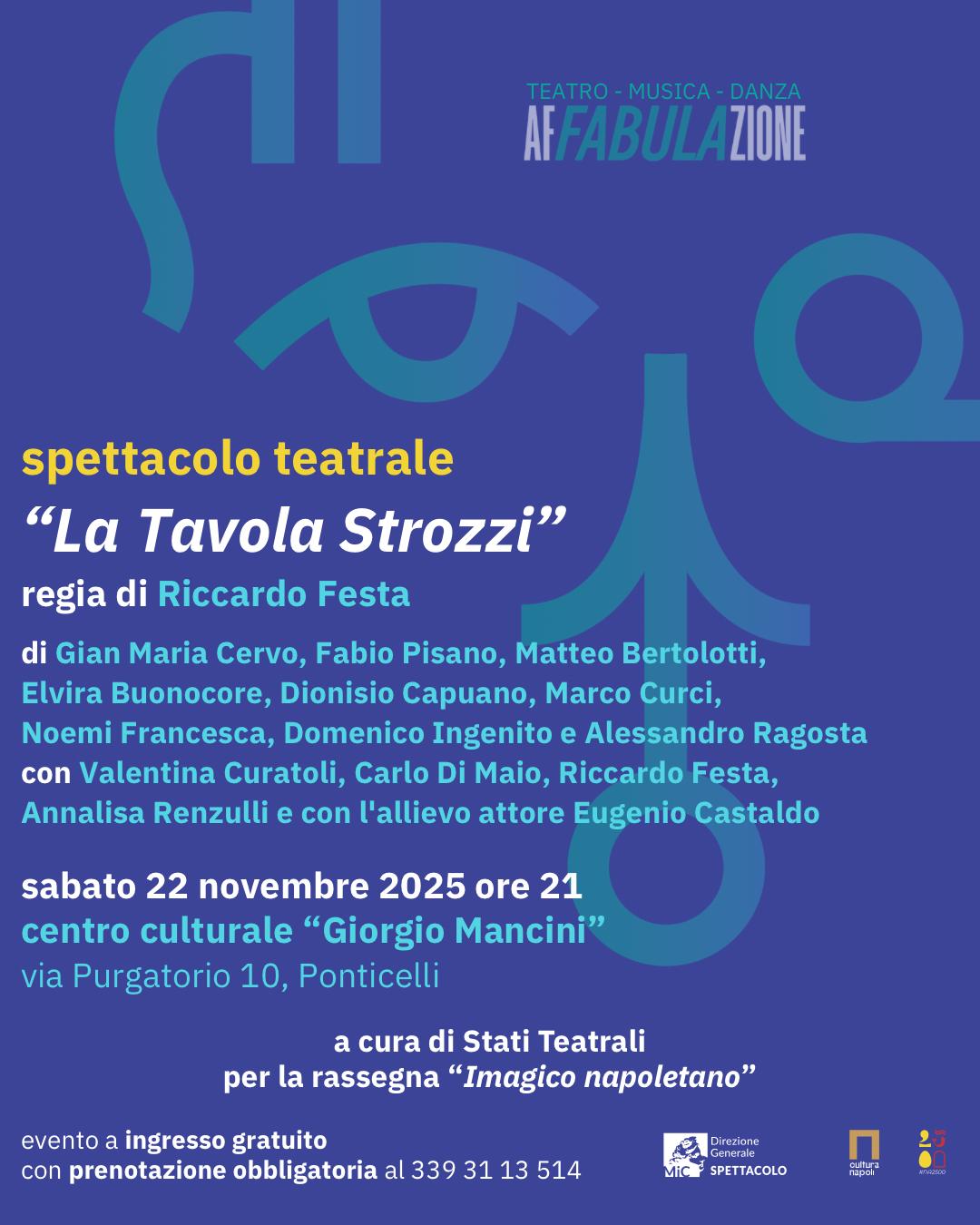 Attesa per “La Tavola Strozzi”, spettacolo teatrale che sabato 22 novembre ore 21:00, presso il centro culturale Arci Movie “Giorgio Mancini”, un’antica masseria del ‘600 in via Purgatorio 10 a Ponticelli, una performance collettiva di drammaturghi napoletani e altri artisti che operano in città prosegue la rassegna “Imagico napoletano”, curata dall’associazione Stati Teatrali nel più ampio cartellone di Affabulazione, programma promosso dal Comune di Napoli e finanziato a valere sul Fondo nazionale per lo spettacolo dal vivo della Direzione Generale Spettacolo del Ministero della Cultura.