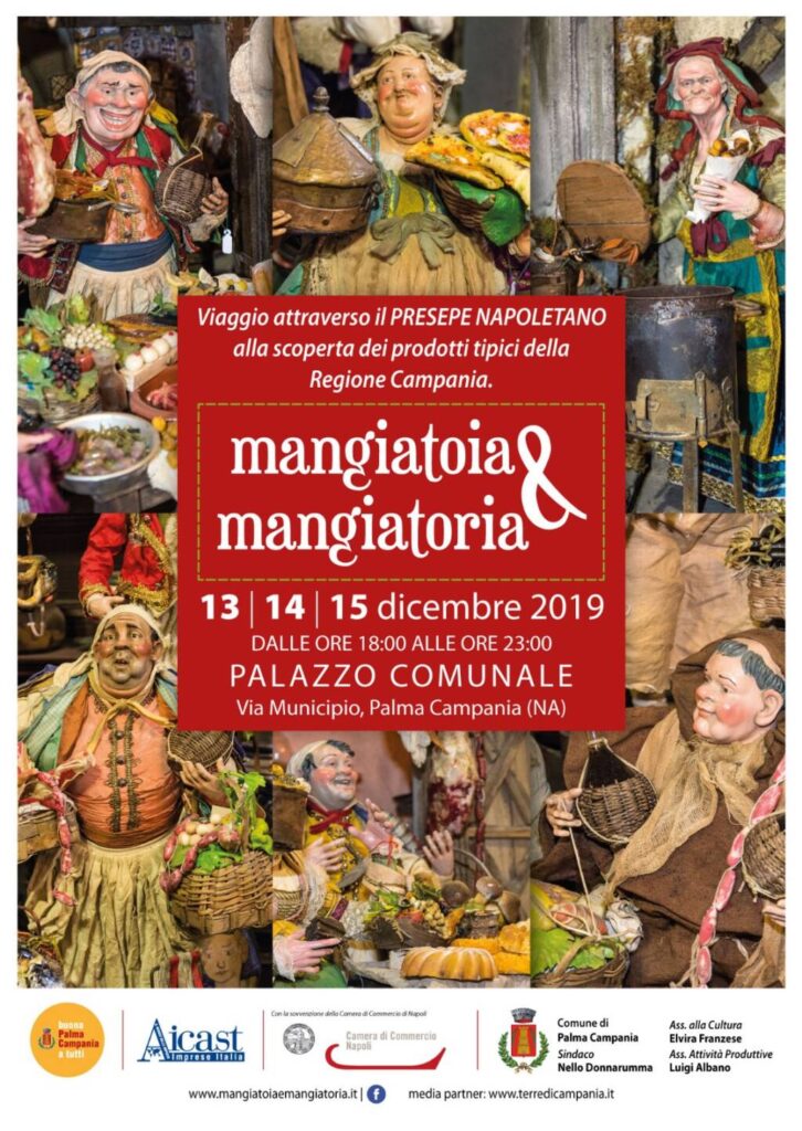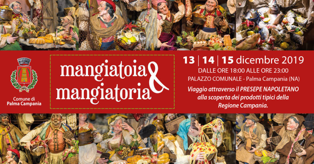 Subito dopo, e per tutti e tre i giorni dell’evento, saranno aperte le Botteghe del Gusto, mostra mercato con prodotti tipici della tradizione natalizia in degustazione e vendita: pane, pasta, vino, olio, formaggi, salumi, prodotti dell’orto, frutta secca, pizza, dolci, castagne, focacce. Una passeggiata lungo “la corte del gusto” per incontrare gli espositori, dialogare con loro e soprattutto assaporare i migliori prodotti del territorio di Palma Campania. Laboratori creativi per grandi e piccoli, animazione, spettacoli di musica e danza, con la partecipazione, tra gli altri, dell’Associazione Quadriglie, dell’Associazione Commercianti e dell’Istituto comprensivo Vincenzo Russo, completeranno il ricco programma delle tre giorni. Ad arricchire ulteriormente lo svolgersi dell’evento, vi sarà, infine, il contemporaneo evento “Storie di cibo e territorio”, voluto dall’Associazione Buona Palma Campania e finanziato dalla Regione Campania, con convegni, mostre e degustazioni dedicati alla riscoperta della tradizione alimentare dal secondo dopoguerra ad oggi. Un’occasione imperdibile, dunque, per immergersi nella magica atmosfera natalizia, nei profumi, i colori e nei suoni di una festa che celebra le nostre tradizioni attraverso la tavola, con una particolare attenzione ai temi del mangiar sano. L’evento “Mangiatoia & Mangiatoria” nasce da un’originale idea di Giuseppe Ottaiano, viaggiatore del buono e del bello della regione Campania, condivisa e accolta dall’amministrazione comunale tutta e, in modo particolare, dal Sindaco Nello Donnarumma e dagli assessori alla Cultura Elvira Franzese e alle Attività produttive Luigi Albano.
