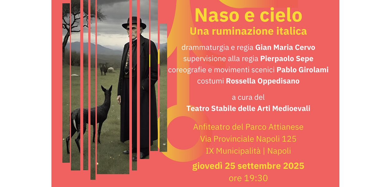 Con un omaggio a Luigi Pirandello si conclude “Pianura Opera House 3”, rassegna organizzata dal Teatro Stabile delle Arti Medioevali, promossa dal Comune di Napoli nell’ambito del progetto “Affabulazione” e finanziata a valere sul Fondo nazionale per lo spettacolo dal vivo della Direzione Generale Spettacolo del Ministero della Cultura. In scena la prima assoluta della pièce “Naso e cielo. Una ruminazione italica”, scritta e diretta da Gian Maria Cervo, drammaturgo napoletano di fama internazionale, con la supervisione alla regia di Pierpaolo Sepe e la collaborazione di Pablo Girolami, che ha curato coreografie e movimenti scenici. L’appuntamento é per giovedì 25 settembre alle ore 19:30 presso l’Anfiteatro del Parco Attianese del quartiere Pianura.
