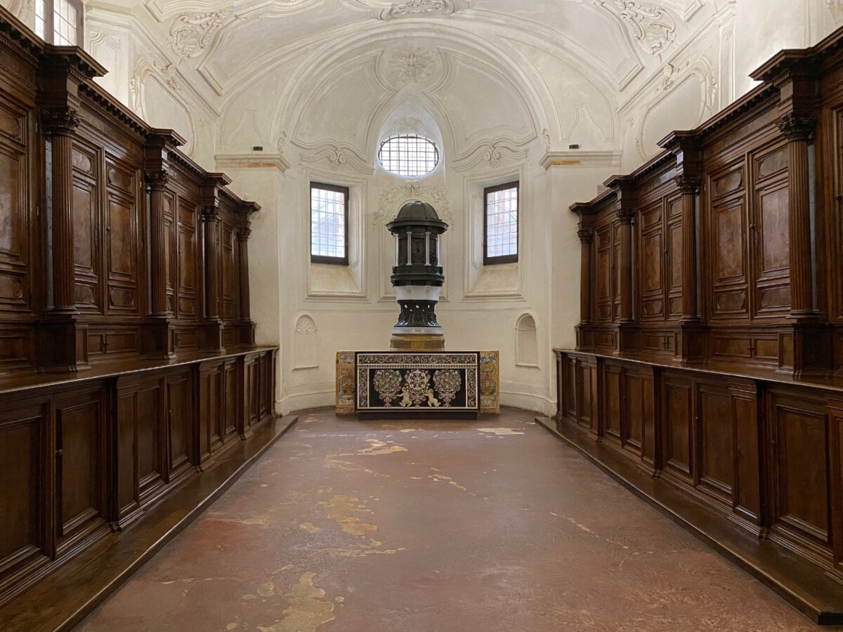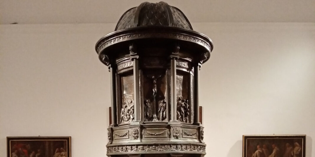 Ma la perla fra le perle del nuovo allestimento è una scultura in bronzo, che normalmente era collocata sull’altare della sagrestia della chiesa di San Lorenzo (sempre in Certosa), ma che per l’occasione è stata spostata nel Quarto del Priore. Si tratta di un tabernacolo ottagonale, alto circa due metri e mezzo, scolpito in tutte le sue parti, che culmina in un cupolino i cui spicchi sono divisi da piccole modanature. Già ad un primo sguardo si nota la somiglianza con un’altra cupola, ben più famosa e più grande, quella di Brunelleschi, ma, quando si osserva il resto della struttura e si vedono gli occhielli forati che decorano la base del tabernacolo, il riferimento diventa certezza. Dunque, citazioni fiorentine in un’opera realizzata nel profondo Regno di Napoli. Come è stato possibile? Partiamo dall’autore: Giacomo del Duca, classe 1520, scultore e architetto nato a Cefalù, molto attivo a Roma tra gli anni ‘60 e gli anni ‘80. E attivo non in un contesto qualsiasi, ma nella bottega di Mastro Michelangelo, che affiancò durante gli ultimi anni di vita, nei lavori per Porta Pia e per Santa Maria degli Angeli. In quest’ultima chiesa in particolare, Del Duca collaborò con il maestro toscano proprio alla realizzazione di un ciborio, di cui purtroppo oggi si sono perdute le tracce.