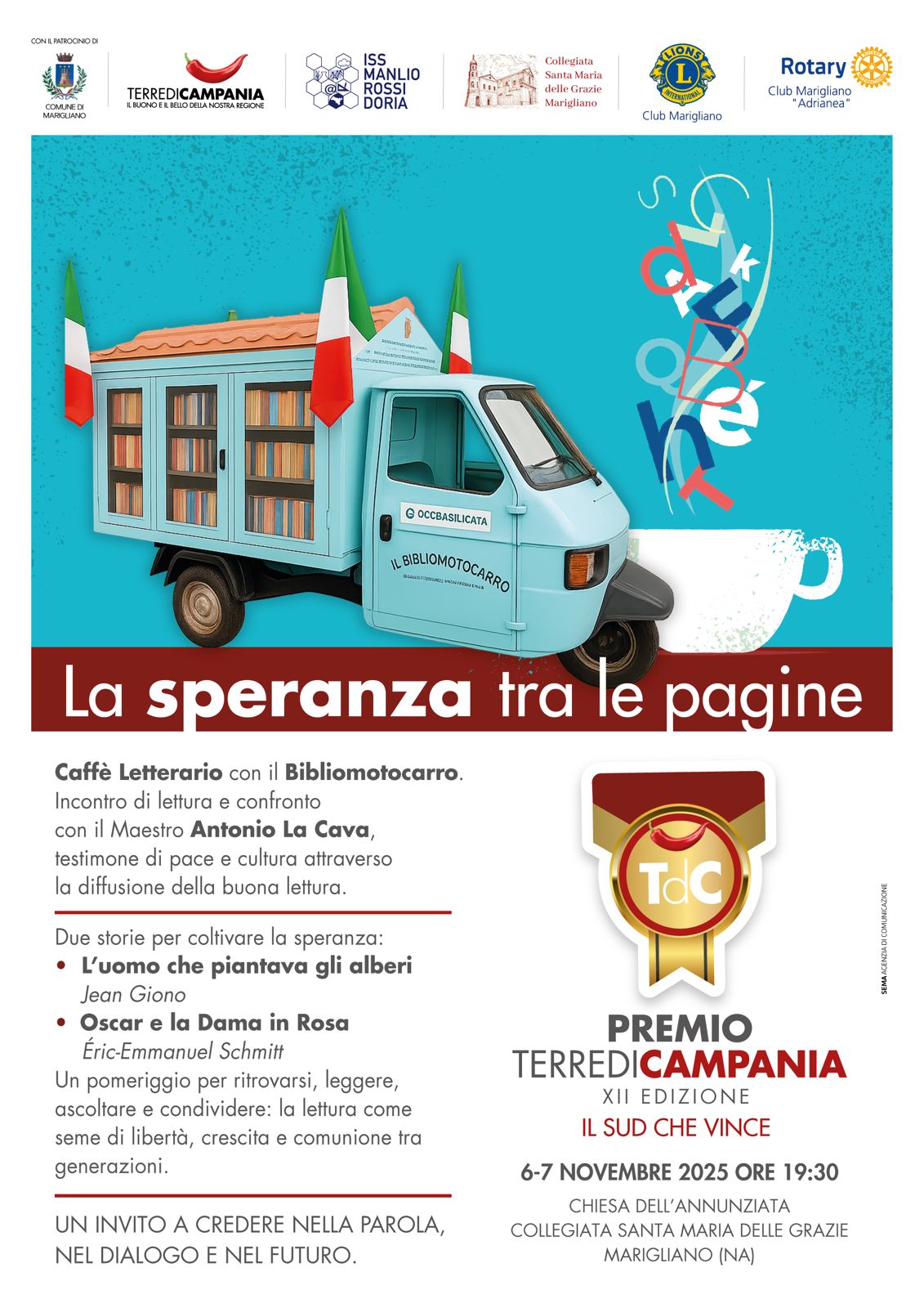 Stasera e domani sera, alle 19:30, gli adulti potranno partecipare ad un Caffè Letterario che sia seme di Speranza e di Pace, idea accolta e patrocinata anche dal  Lions Club Marigliano e dal Rotary Club Marigliano “Adrianea”. Una serata per ritrovarsi tra le pagine di un libro, per riscoprire il valore della parola, del silenzio e del dialogo, con due storie per coltivare la speranza: L’uomo che piantava gli alberi – Jean Giono; Oscar e la Dama in Rosa – Éric-Emmanuel Schmitt.