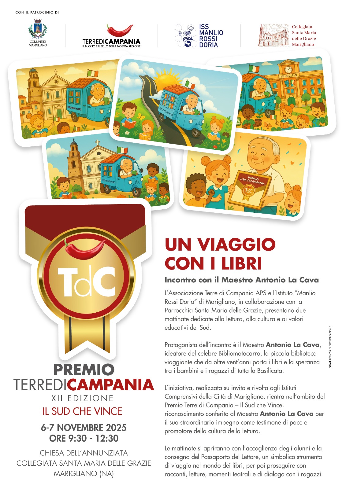 Quest’anno il Premio IL SUD CHE VINCE va al Maestro Antonio La Cava, un maestro in pensione che non ha mai voluto smettere la propria opera educativa e ha creato il Bibliomotocarro, un’Ape trasformata in Biblioteca ambulante, che gira i paesi della Basilicata interna portando la gioia di leggere ai bambini che lo aspettano festanti. Il Maestro vive a Ferrandina e da lì si sposta raggiungendo i paesi lucani dove non esiste biblioteca; incontra i bambini, parla loro dei libri e li lascia in prestito, per passare poi a ritirarli dopo un mese circa. Il prestito è fiduciario, senza registro dei prestiti, perché, spiega il maestro: “Educare alla fiducia vuol dire educare alla responsabilità, alla tutela di un bene comune quale un libro prestato. Quel libro, infatti, oggi rende felice un bambino, ma domani servirà ad un altro.” Educazione alla lettura, cultura, educazione civica e alla solidarietà: sono solo alcuni dei valori che Antonio La Cava mette in campo, ricevendo, come lui stesso afferma, più di quanto gratuitamente doni.