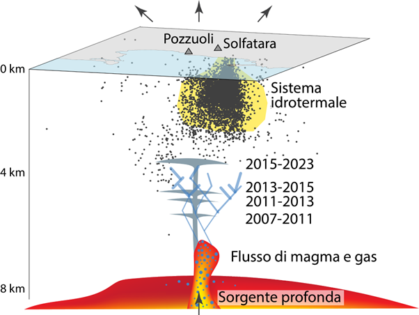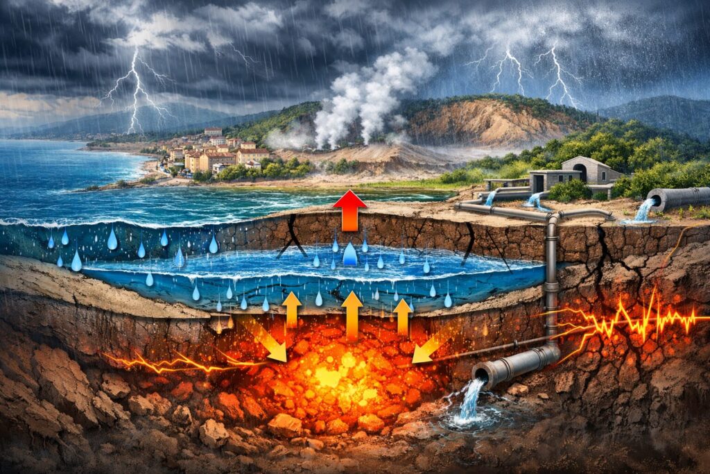 Il lavoro dimostra che l’infiltrazione dell’acqua meteorica, nei serbatoi idrotermali superficiali, può contribuire fino a 5 cm di sollevamento all’anno, rappresentando oltre il 20% del sollevamento totale, registrato tra il 2005 e il 2025 nell’area di Pozzuoli. L’analisi integra i dati pluviometrici dal 1950 con quelli di sollevamento della stazione RiTe (Rione Terra), rivelando “come la geometria del sottosuolo condizioni la migrazione dei fluidi e la risposta deformativa del sistema vulcanico”. Secondo gli autori, la presenza di una struttura anticlinalica sotto Pozzuoli favorisce l’accumulo e la pressurizzazione dei fluidi in serbatoi, posti a diverse profondità. In quelli più superficiali si accumula l’acqua piovana, quando la velocità di scarico a mare viene rallentata, mentre nei serbatoi più profondi si accumulano principalmente i fluidi che essolvono dal magma stazionario in lento e continuo raffreddamento, quando non riescono a fuoriuscire.